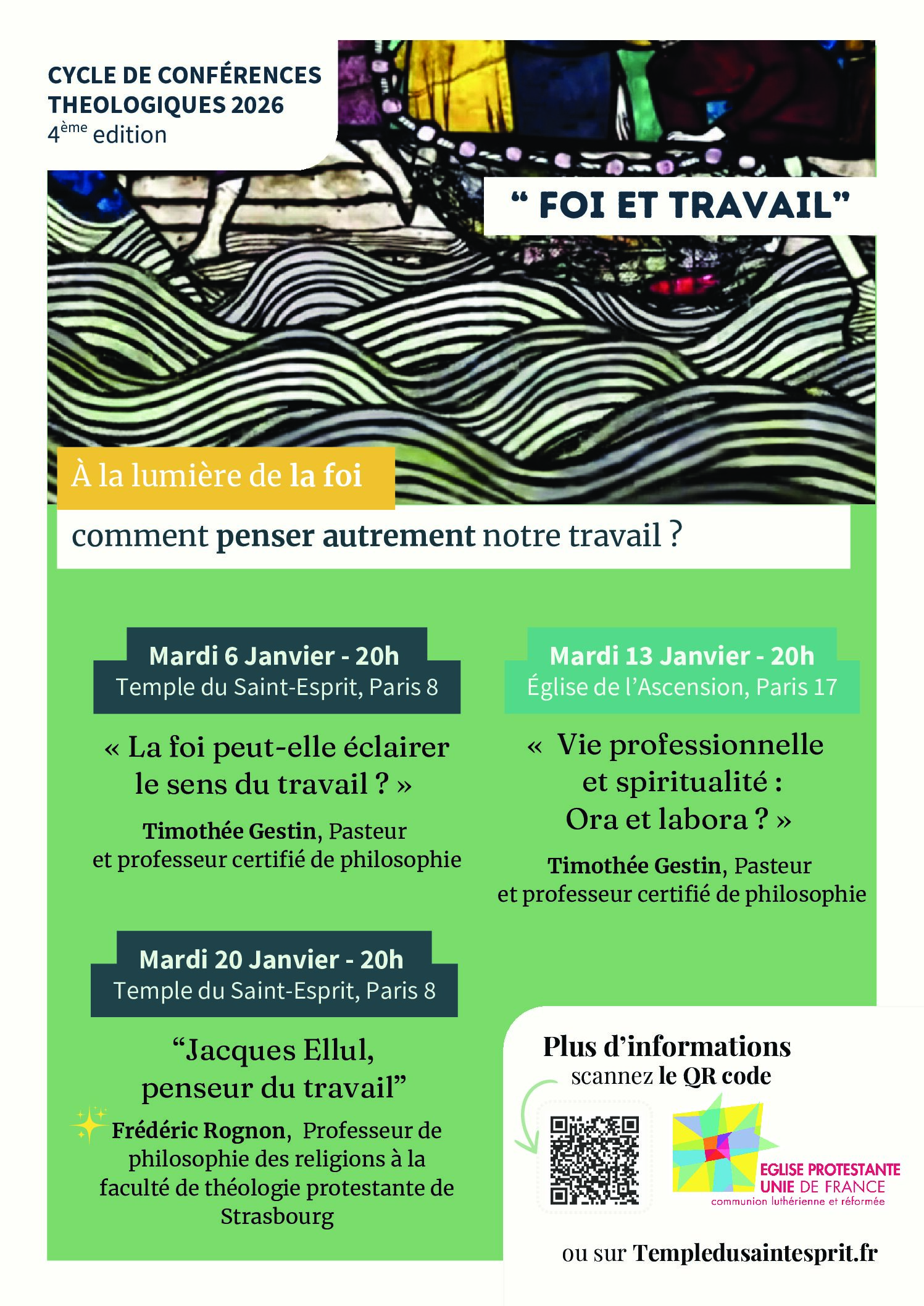 Pour cette quatrième édition, les rencontres seront au nombre de trois. Elles auront lieu les mardis 06, 13 et 20 janvier de 20h00 à 21h15, en alternance entre le temple du Saint-Esprit et l’église luthérienne de l’Ascension (47 rue Dulong, Paris 17ème). Début du cycle le mardi 06 janvier au temple du Saint-Esprit.